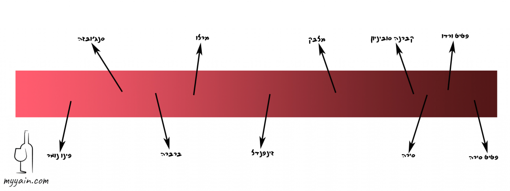 - בעלי גוף כבד – יינות אדומים אשר מציעים מגוון של טעמים עם איזון של חומציות, הגורם להם להתאים למגוון רחב של מאכלים, הם יינות בעלי טאנינים כבדים ואגרסיביים יותר. ישנם יינות שיהיה קל לשתות ללא לווי של אוכל כמו סנגיובזה, מרלו, זיפנדל, וישנם אף כבדים יותר כמו שיראז (סירה) קברנה סובניון שהם כבר יינות אדומים מלאי גוף בעלי צבע הכהה והעמוק ביותר מבין כל היינות האדומים.